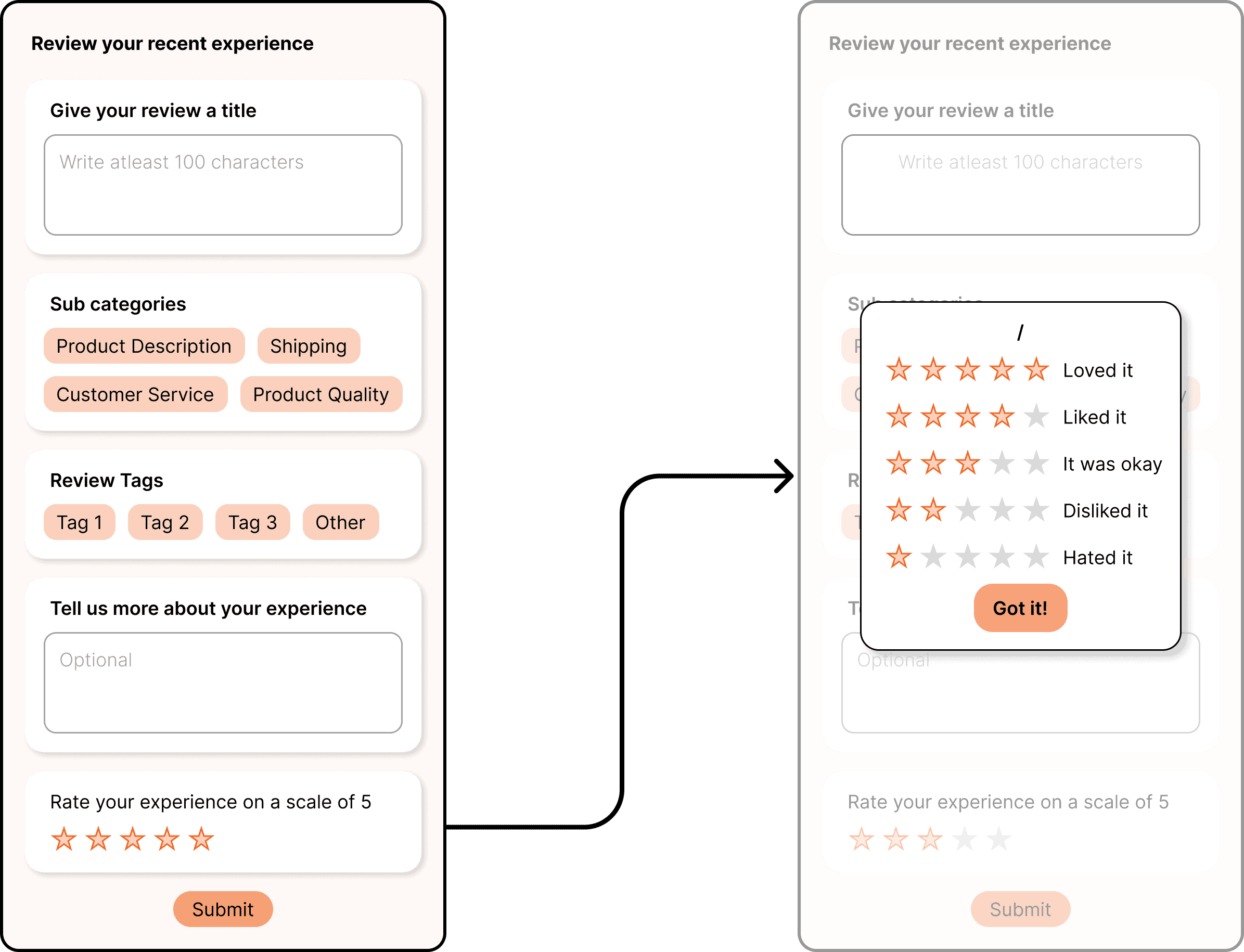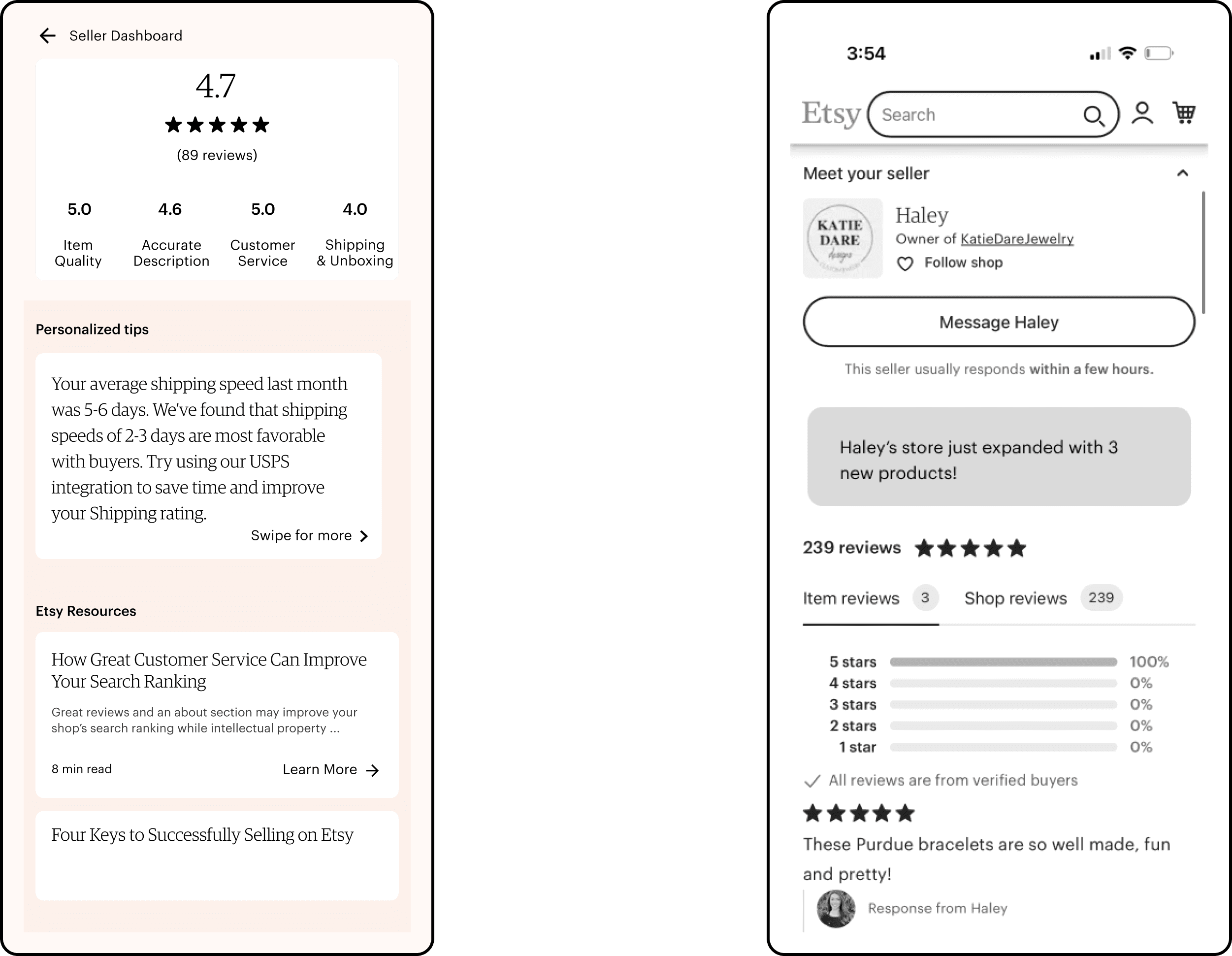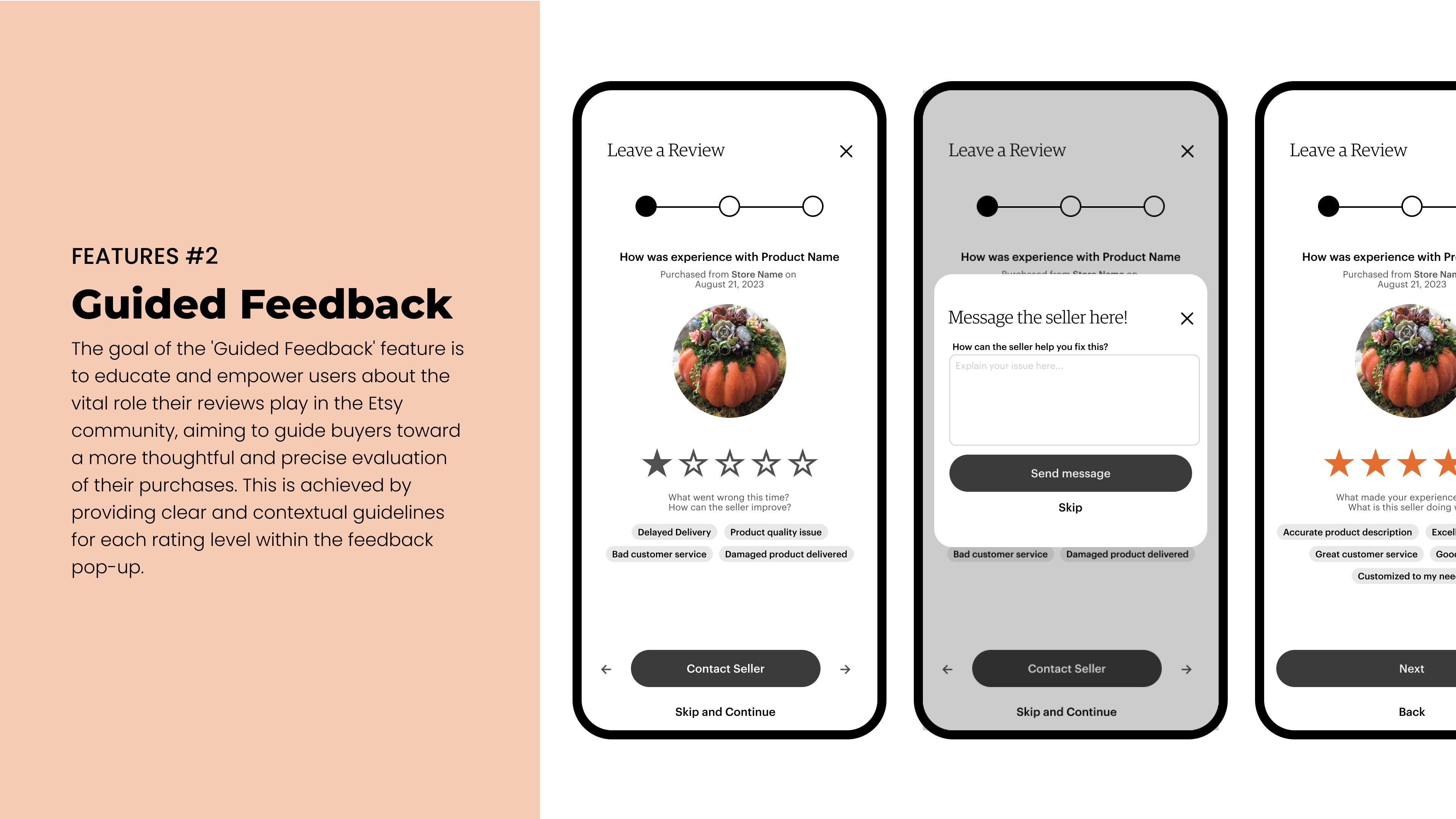 he goal of the "Guided Feedback" feature is to educate and empower users about the vital role their reviews play in the Etsy community aiming to steer buyers towards a more thoughtful and precise evaluation of their purchases. By providing clear and contextual guidelines for each rating level within the feedback pop-up.