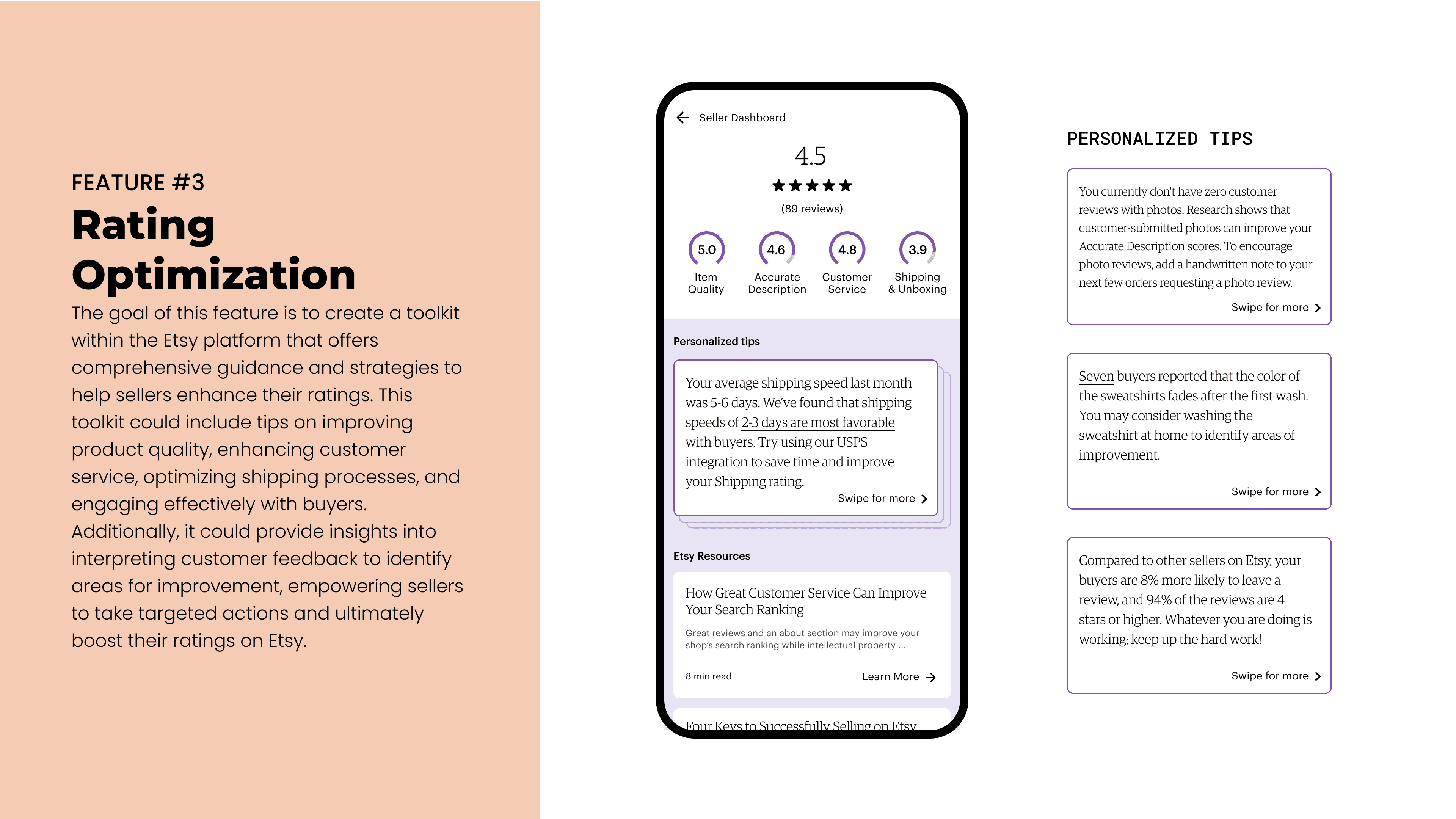 The goal of this feature is to create a toolkit within the Etsy platform that offers comprehensive guidance and strategies to help sellers enhance their ratings. This toolkit could include tips on improving product quality, enhancing customer service, optimizing shipping processes, and engaging effectively with buyers. Additionally, it could provide insights into interpreting customer feedback to identify areas for improvement, empowering sellers to take targeted actions and ultimately boost their ratings on Etsy.