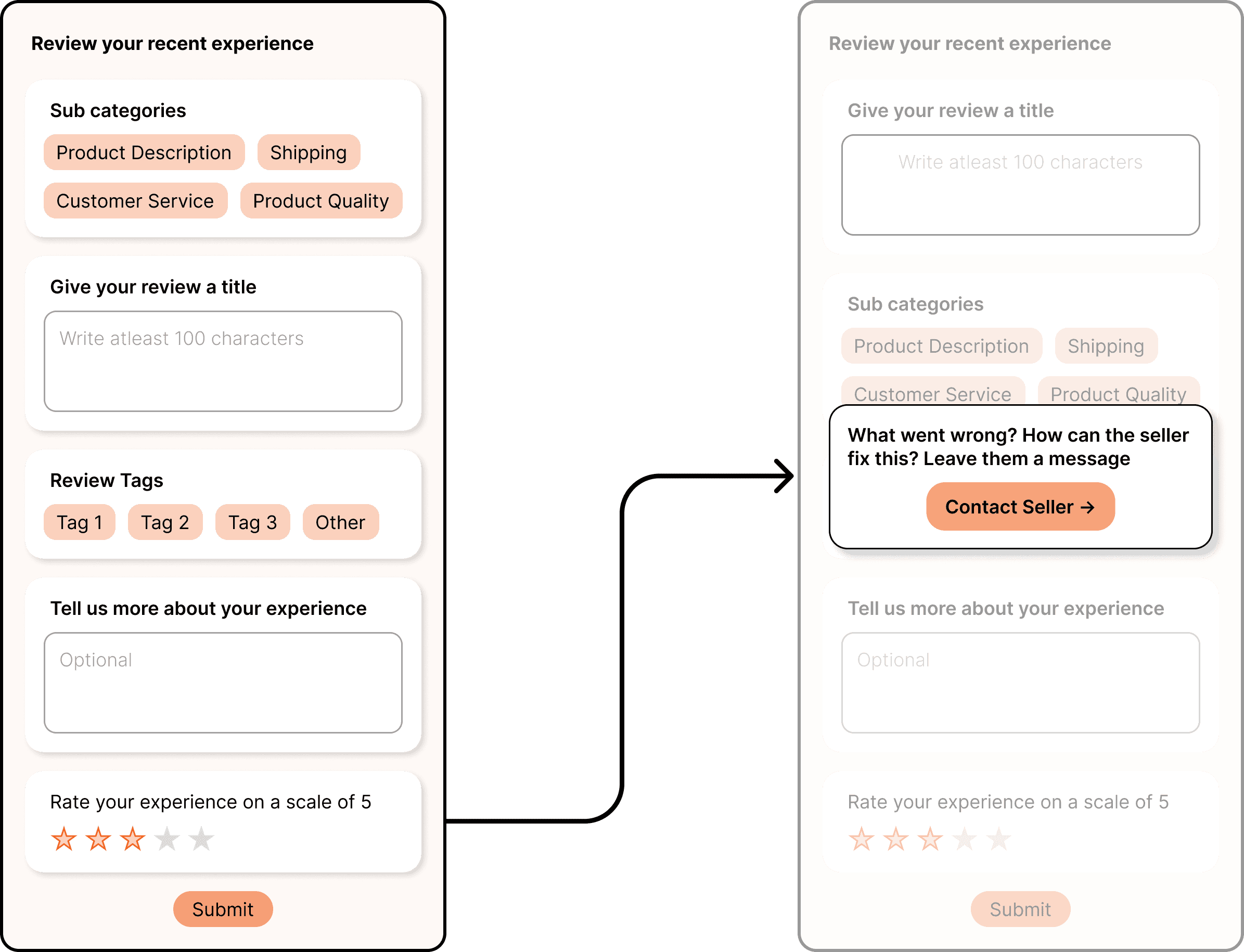Revamping the 5-star evaluation process for sellers providing services on online platform, as an academic project for UX Design Grad Studio. The goal was to create a fair and balanced evaluation system that benefits both buyers and sellers, by reimagining the conventional 5-star rating system. The project's scope enabled us to introduce features for sellers to present improvements based on shoppers feedback.