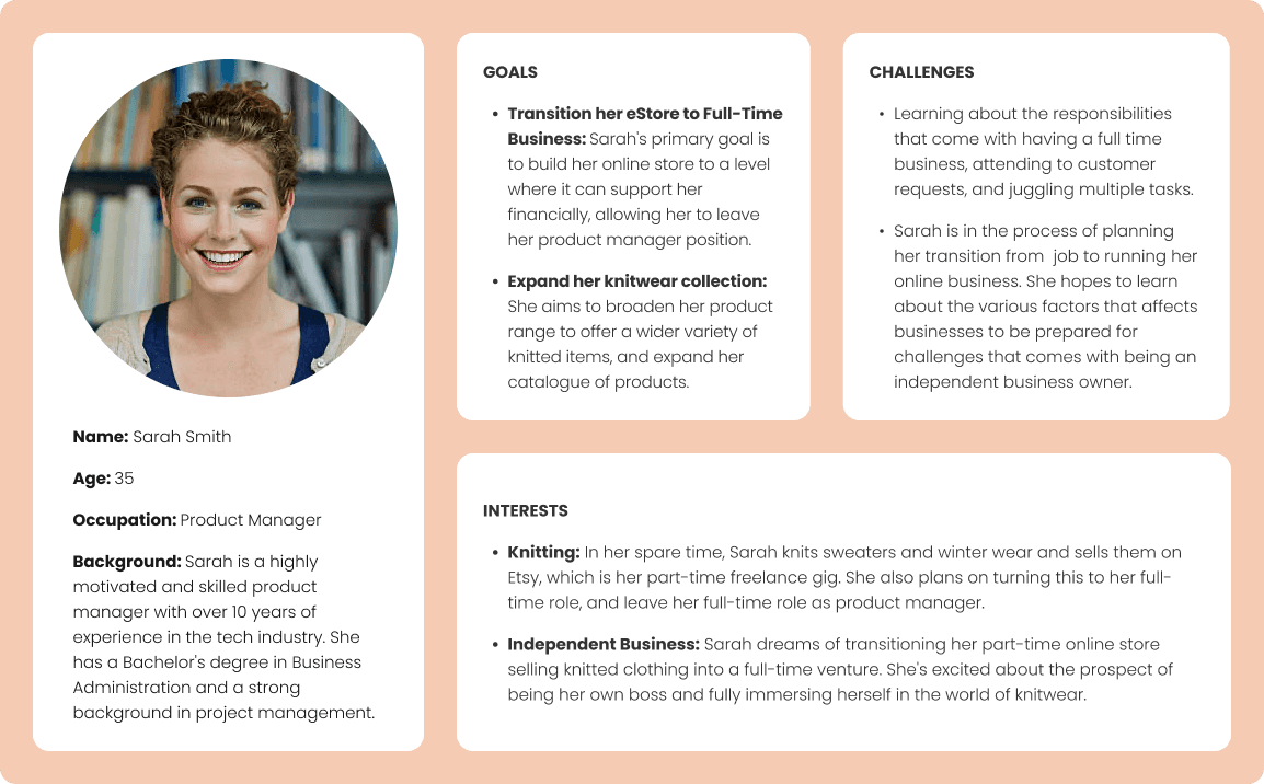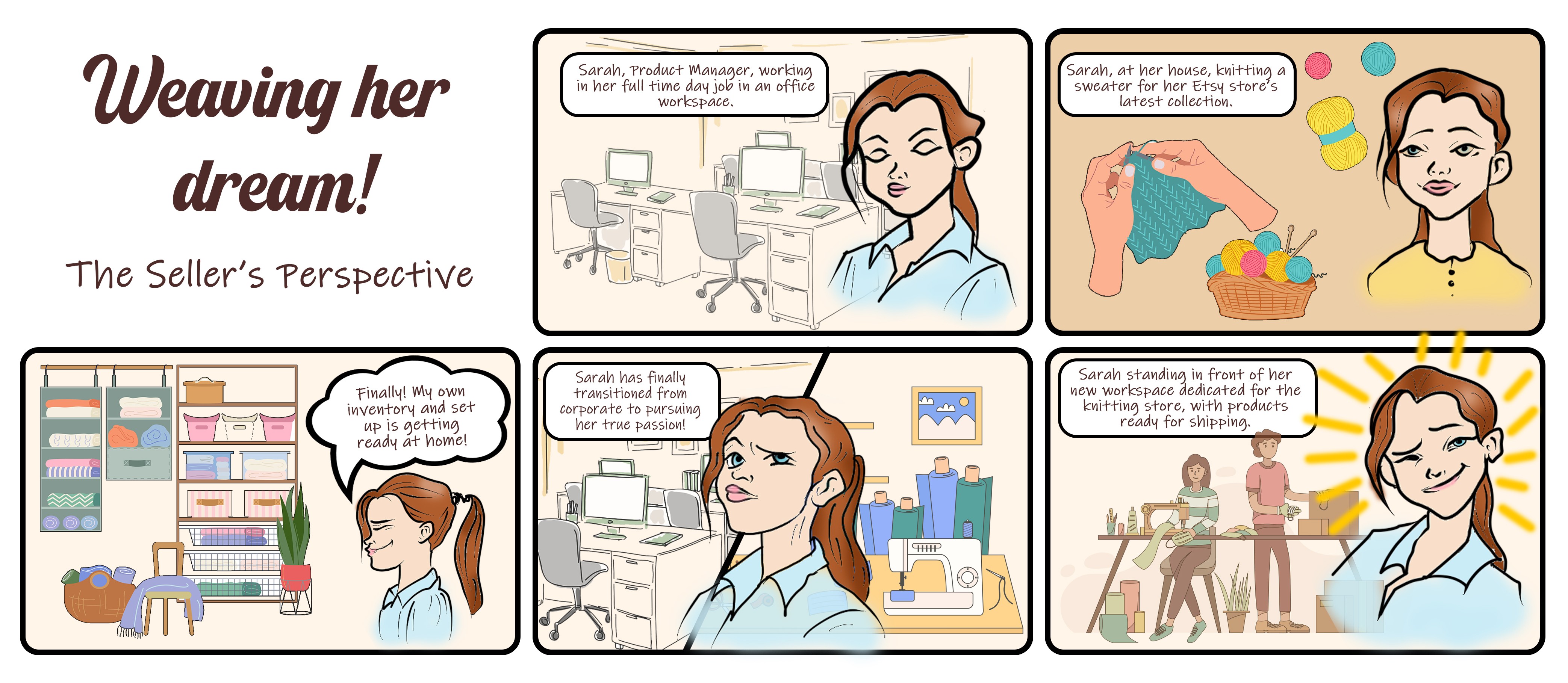 From our insights and analysis of research data, we identified two main user groups: sellers (small business owners) and buyers. To better understand their needs, we developed personas for these stakeholders, which were crucial for efficiently identifying and communicating user needs. The personas, along with user scenario storyboard, further guided our process in identifying user needs and pinpointing key issues.