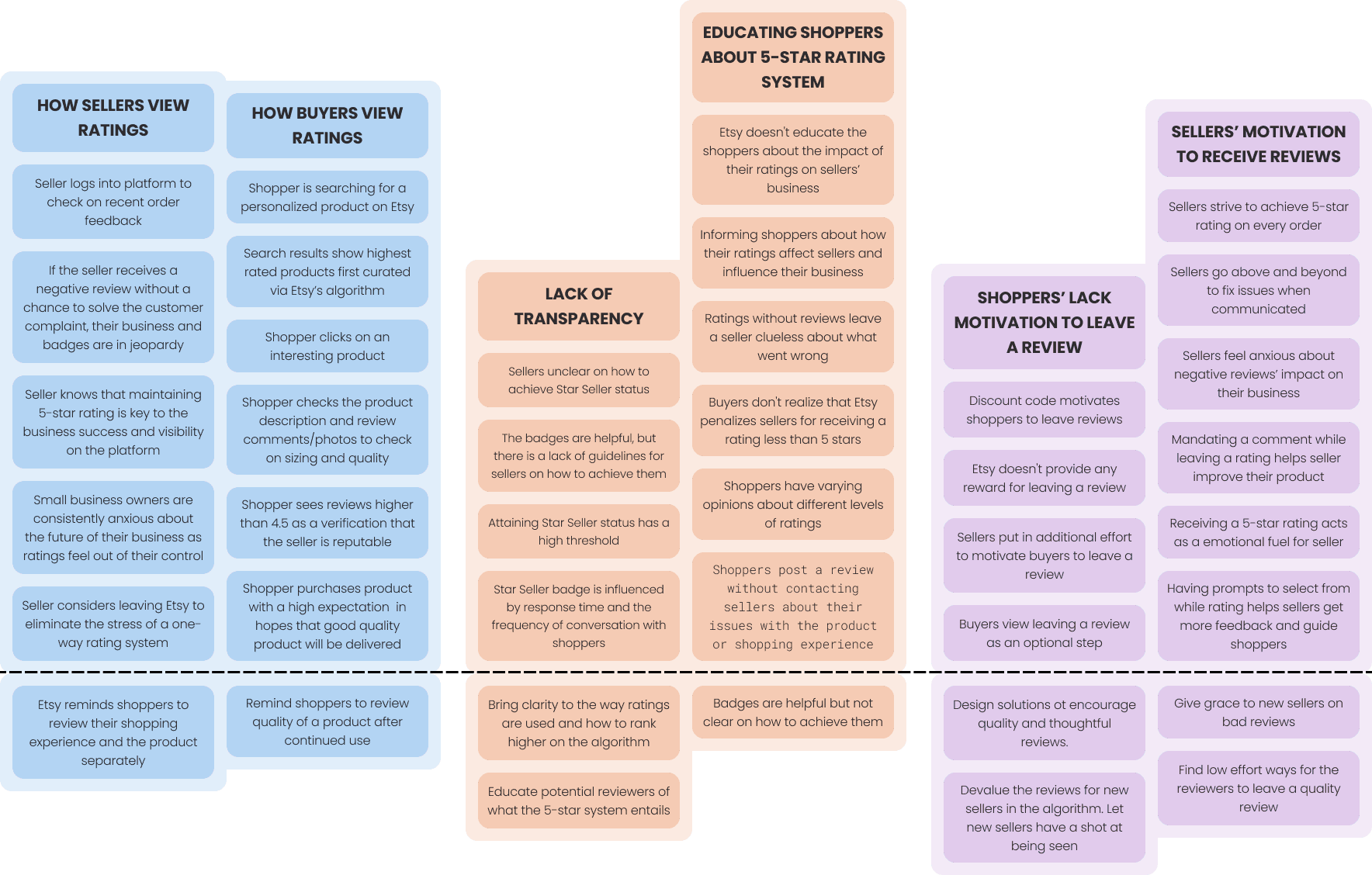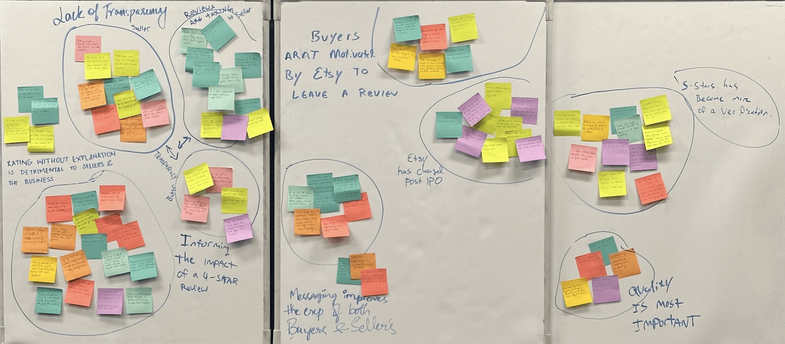 After conducting interviews and surveys with the main target user group, we affinity-mapped the insights to categorize the data and identify common issues that sellers were experiencing with the platform. We then synthesized the data to develop themes aimed at solving user problems and improving the rating and reviewing experience for both the seller and buyer user groups.