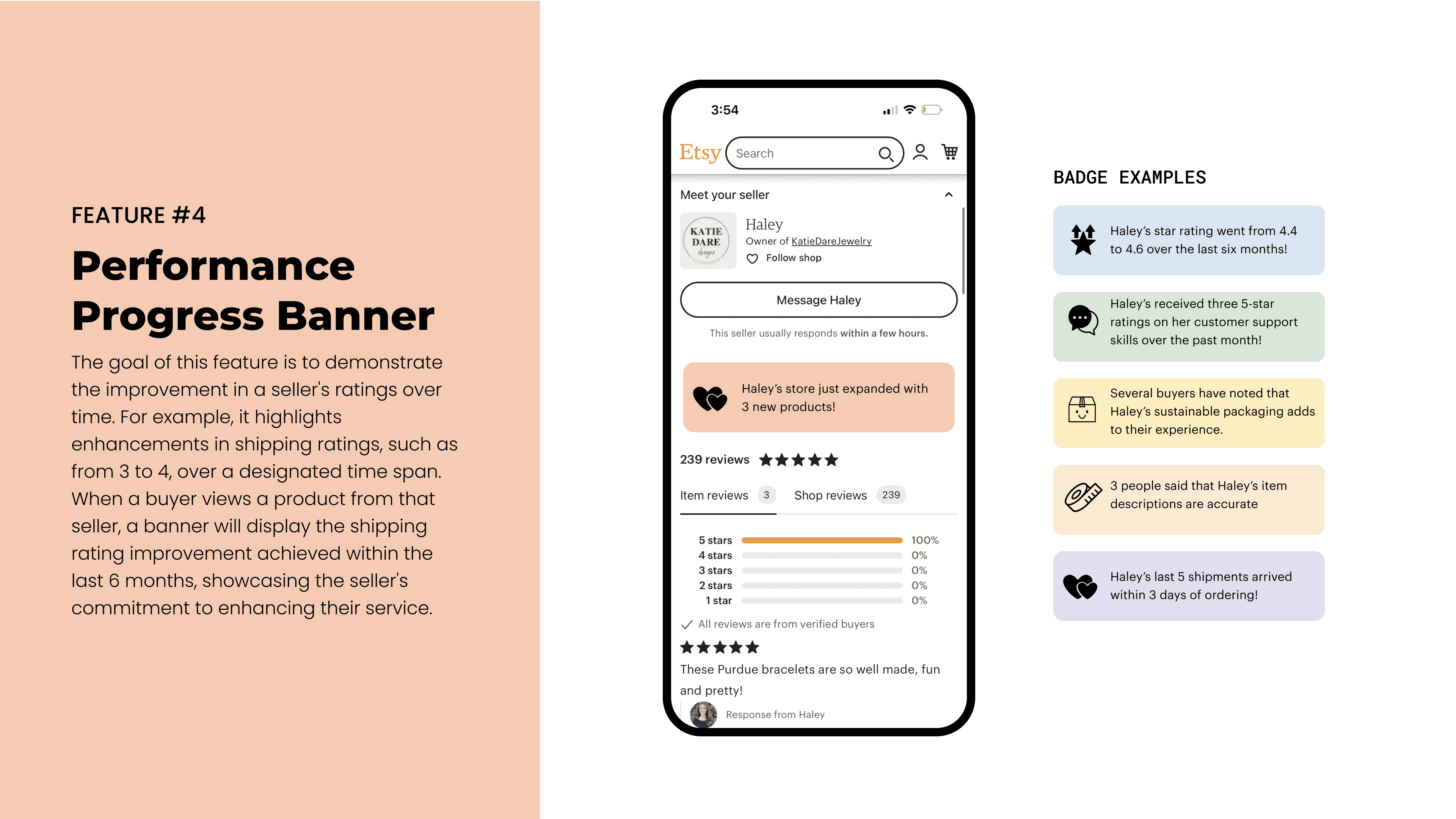 The goal of this feature is to exhibit the improvement in a seller's ratings over time. For example, it highlights enhancements in shipping ratings from for instance 3 to 4 over a designated time span. When a buyer views a product from that seller, a banner will display the shipping rating improvement achieved within the last 6 months, showcasing the seller's commitment to enhancing their service.