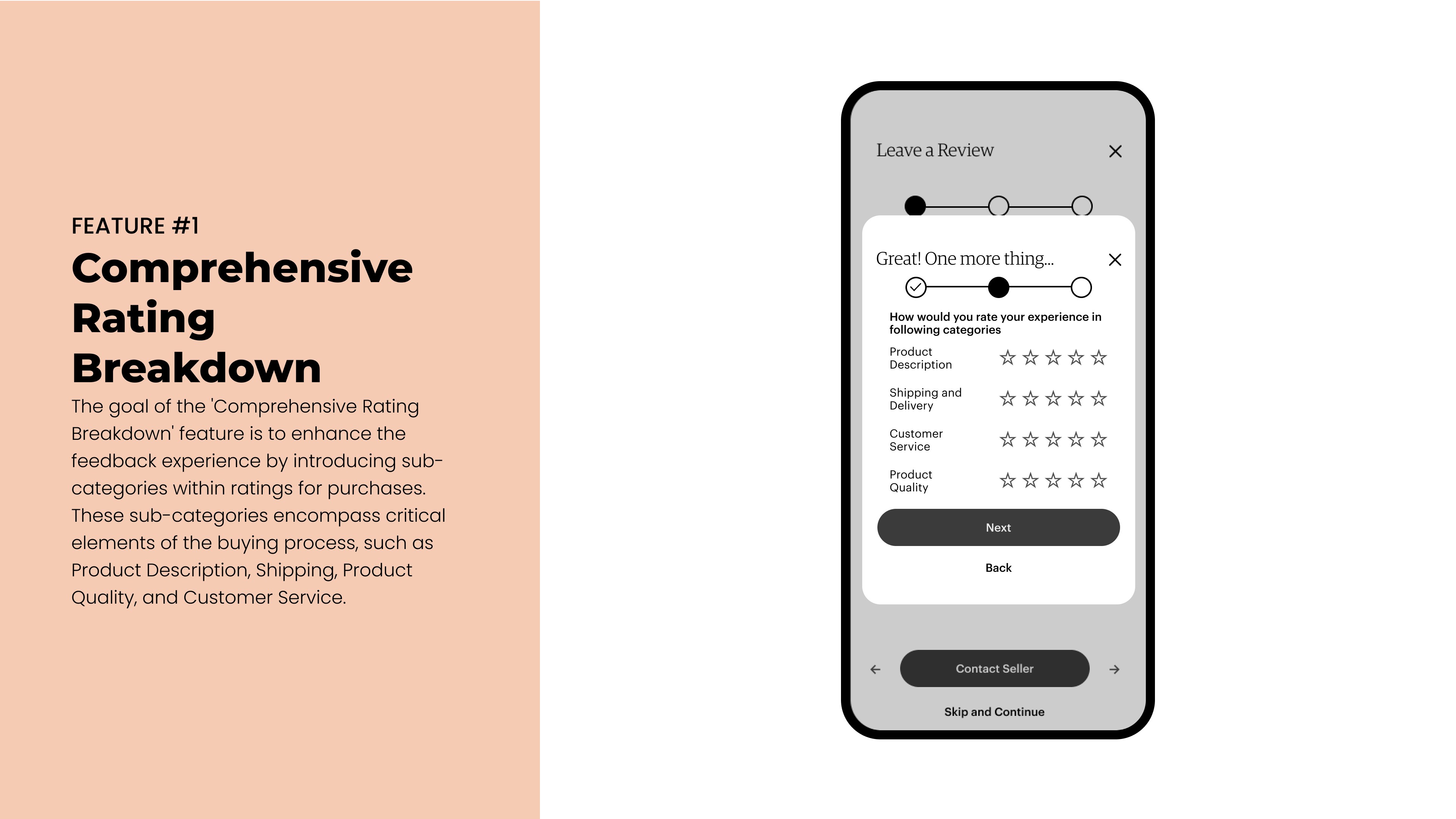The goal of the "Comprehensive Rating Breakdown" feature is to elevate the feedback experience by introducing sub-categories within ratings for purchases. These sub-categories encompass critical elements of the buying process such as Product Description, Shipping, Product Quality, and Customer Service.